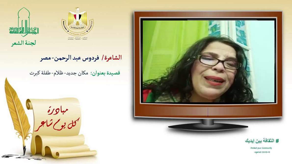 يستضيف المجلس الأعلى للثقافة، من خلال مبادرة كل يوم شاعر في الساعة السادسة من مساء الإثنين الموافق 28 سبتمبر المقبل، الكاتبة والشاعرة فردوس عبد الرحمن، لتلقي مجموعة قصائد شعرية معنونة بـ "مكان جديد - ظلام - طفلة كبرت".