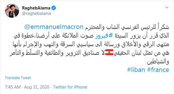 وجه الفنان راغب علامة عبر حسابه على موقع التغريدات الشهير "تويتر"، الشكر للرئيس الفرنسي إيمانويل ماكرون، بعد قراره المتمثل في زيارة جارة القمر الفنانة اللبنانية الكبيرة فيروز، خلال تواجده في العاصمة اللبنانية بيروت اليوم الاثنين.