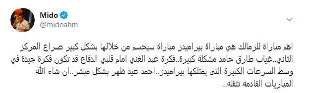 وكتب أحمد حسام "ميدو" تغريدة على تويتر: "أهم مباراة للزمالك هي مباراة بيراميدز مباراة سيحسم من خلالها بشكل كبير صراع المركز الثاني.. غياب طارق حامد مشكلة كبيرة..فكرة عبد الغني أمام قلبي الدفاع قد تكون فكرة جيدة في وسط السرعات الكبيرة التي يمتلكها بيراميدز.. أحمد عيد ظهر بشكل مبشر.. إن شاء الله المباريات القادمة تتقله..".