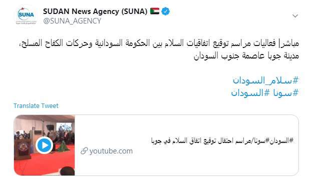 بثت وكالة الأنباء السودانية "سونا" مراسم توقيع اتفاقيات السلام بين الحكومة السودانية وحركات الكفاح المسلح، بمدينة جوبا عاصمة جنوب السودان.