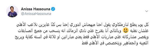 وكتبت أنيسة حسونة تغريدة على تويتر ": كل يوم يطلع لنا زملكاوي يقول احنا ميهمناش الدوري إحنا بس كنّا عايزين نلاعب الأهلي علشان نغلبه.. وبالتالي أنا بقترح علي نادي الزمالك انه ينسحب من جميع المسابقات ويقصر مشاركاته علي مباريات الأهلي فقط يعني مباراتين او ثلاثة في السنه كفاية ويريح اللعيبه والجماهير ويتخصص في الأهلي فقط"