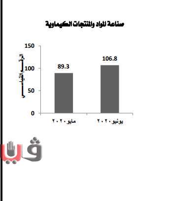 بلـغ الرقـم القيـاسي لصناعة المواد والمنتجات الكيماوية 106.8 خلال شهر يونيو 2020 مقارنة بشهر مايو 2020 حيث بلغ 89.3 بارتفــاع قدره 19.6%.