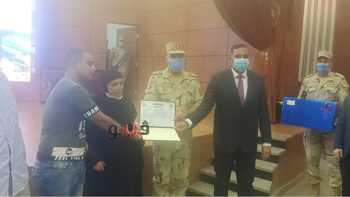 وتسلمت أسر الشهداء محمود صبحي عبد الحميد المهدي، احمد محمود عبد الفتاح، احمد جمال البهنساوي شهادات التقدير، تحت شعار الإيمان والعلم والتعاون كدور أساسي لقوات الدفاع الشعبي والعسكري.