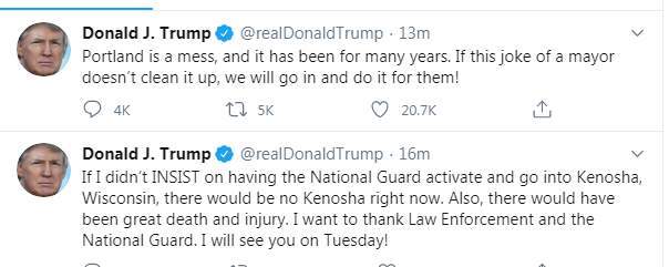 وكتب دونالد ترامب تغريدة على تويتر: "إذا لم أصر على تنشيط الحرس الوطني والذهاب إلى كينوشا، الرئيس الأمريكي دونالد ترامب، فلن يكون هناك كينوشا في الوقت الحالي.