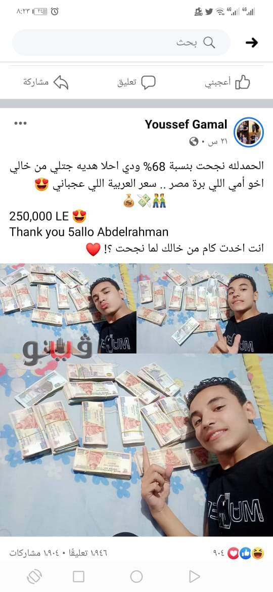 شهدت مواقع التواصل الاجتماعي بالقليوبية جدلا واسعا بعد نشر طالب يدعي يدعي "يوسف جمال" ابن مدينة طوخ بالقليوبية، صور له وبجوار مبلغ مالي يقدر بربع مليون جنيه معلقا أن خاله اهداها له بمناسبة نجاحة في الدبلوم وحصوله علي مجموعه 68%.