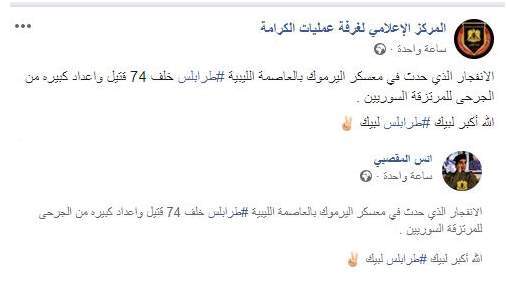 أعلن المركز الإعلامي لغرفة عمليات الكرامة التابع للجيش الليبي عن مقتل 74 وأعداد كبيرة من الجرحى ضمن المرتزقة السوريين الذين جلبتهم تركيا في انفجار وقع بمعسكر اليرموك التابع للميليشيات في طرابلس.