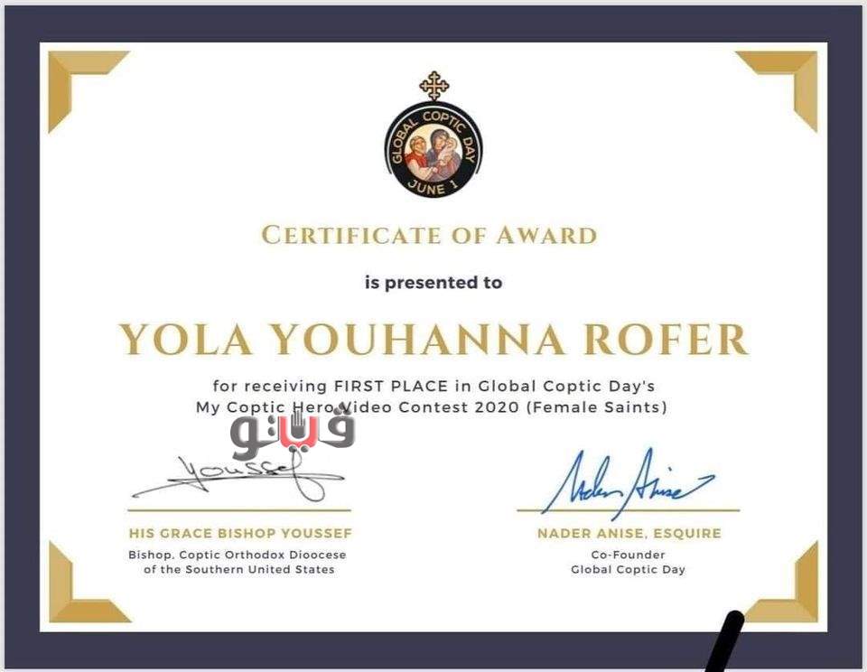 حصلت يولا يوحنا روفير ابنة كنيسة أول الشهداء إسطفانوس بقوص (إيبارشية قوص ونقادة)، على المركز الأول في مسابقة "بطلي القبطي" والتي نظمتها إيبارشية جنوبي الولايات المتحدة بمناسبة اليوم القبطي العالمي Global Coptic Day.