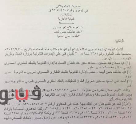 براءة 3 مسئولين من القيادات القانونية بالبنك العقاري المصري من ارتكاب مخالفات