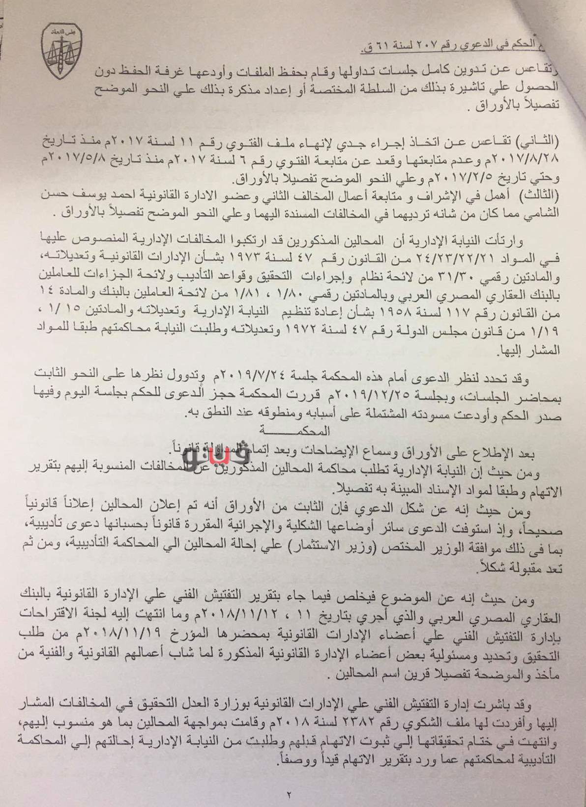 المحال الثاني، وعضو الإدارة القانونية أحمد يوسف حسن، فأصدرت المحكمة حكمها