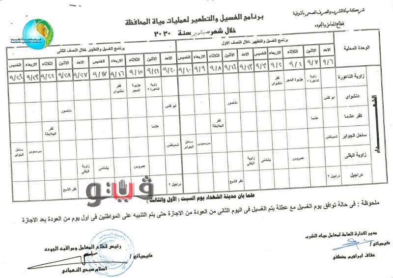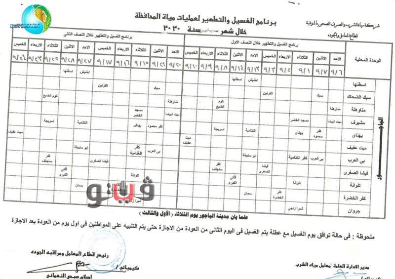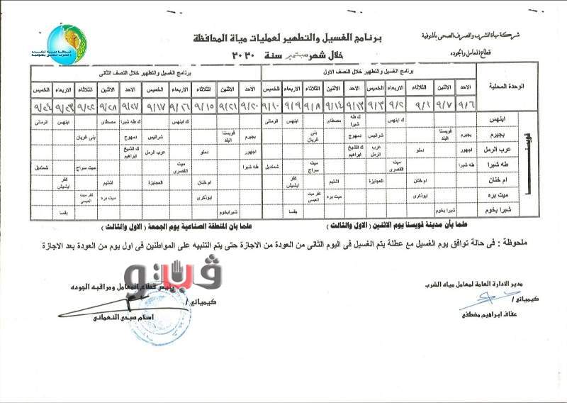 أعلن المهندس محمد نجيب رئيس شركة مياة الشرب والصرف الصحى بالمنوفية عن خطة غسيل شبكات المياه بكافة مناطق المحافظة خلال شهر سبتمبر الحالي و فقاً للمناطق المحددة بجدول الغسيل الدوري.
