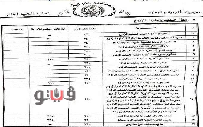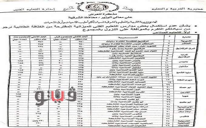 وتابع : مدرسة منيا القمح الصناعية بنين 230 عام 185 مهني، مدرسة منيا القمح الصناعية بنات 230 عام 185 مهني مدرسة مشهور الصناعية المشتركة 230 عام و170 مهني، البوز الصناعية بنات 230، القرين الصناعية المشتركة 230 بنين، ههيا الصناعية بنين235 عام 185 مهني ، ههيا الصناعية بنات 235 عام 185 مهني.