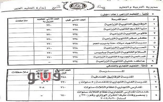 واشار الي أن درجات القبول بمدارس التعليم الزراعي ( عام- مهني ) جاءت كالاتي : الزقازيق الثانوية الزراعية 220 , منيا القمح الثانوية الزراعية 220 , فاقوس الثانوية الزراعية 230 , كفر صقر الثانوية الزراعية 230 الشهيد ميلاد حنا بديرب نجم 220 , الحسينية الثانوية الزراعية 220 , السلام الثانوية الزراعية ببلبيس 220.