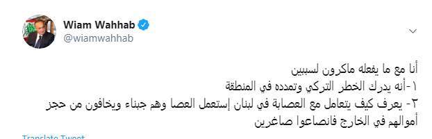 وكتب وئام وهاب تغريدة على تويتر "أنا مع ما يفعله ماكرون لسببين.. ١-أنه يدرك الخطر التركي وتمدده في المنطقة.. ٢- يعرف كيف يتعامل مع العصابة في لبنان إستعمل العصا وهم جبناء ويخافون من حجز أموالهم في الخارج فانصاعوا صاغرين".