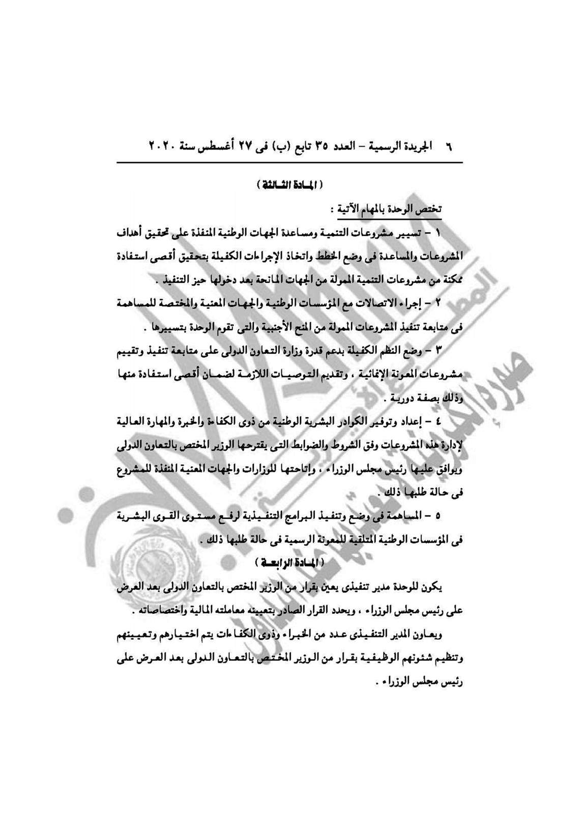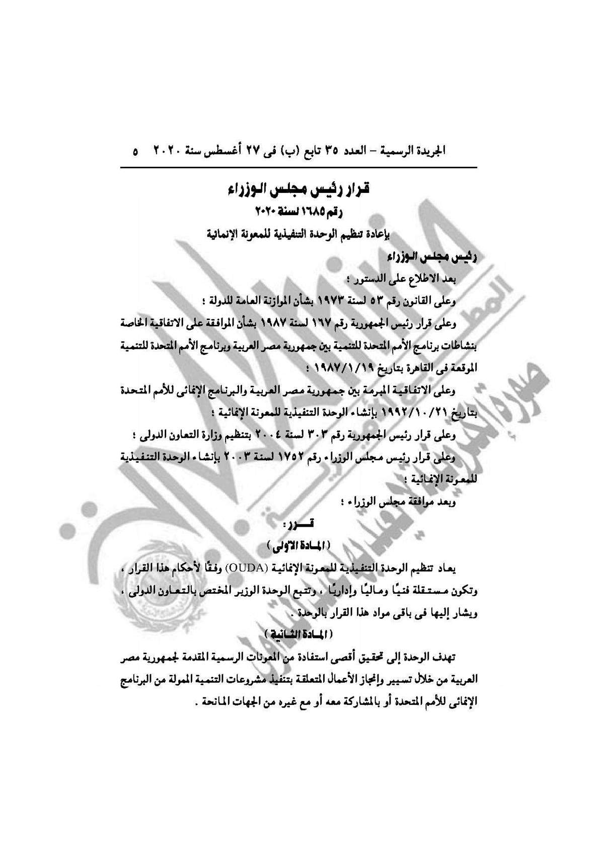 - القرار رقم 1685 لسنة 2020، بإعادة تنظيم الوحدة التنفيذية للمعونة الإنمائية.