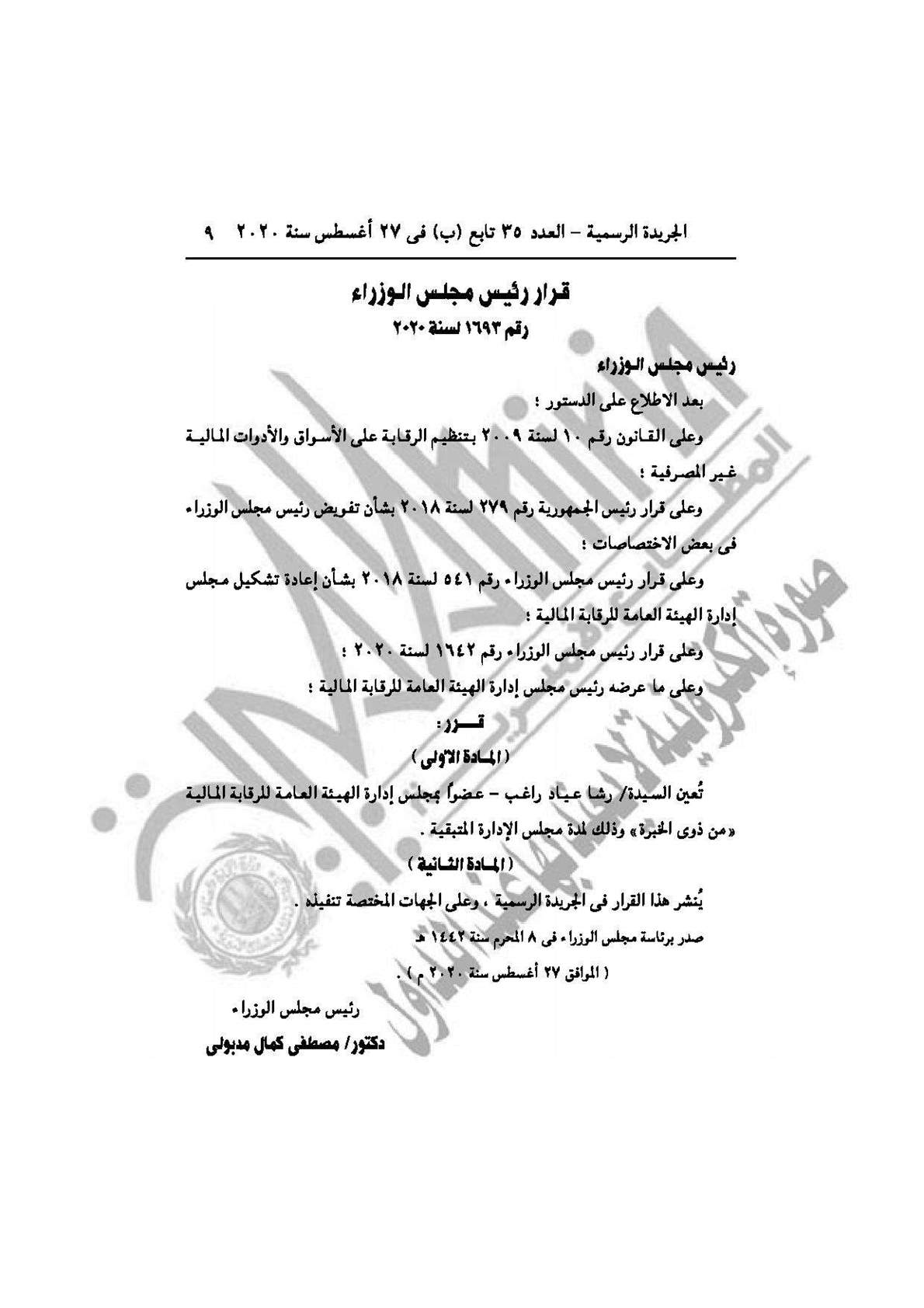 - القرار رقم 1693 لسنة 2020، بتعيين رشا عياد راغب عضوًا بمجلس إدارة الهيئة العامة للرقابة المالية.