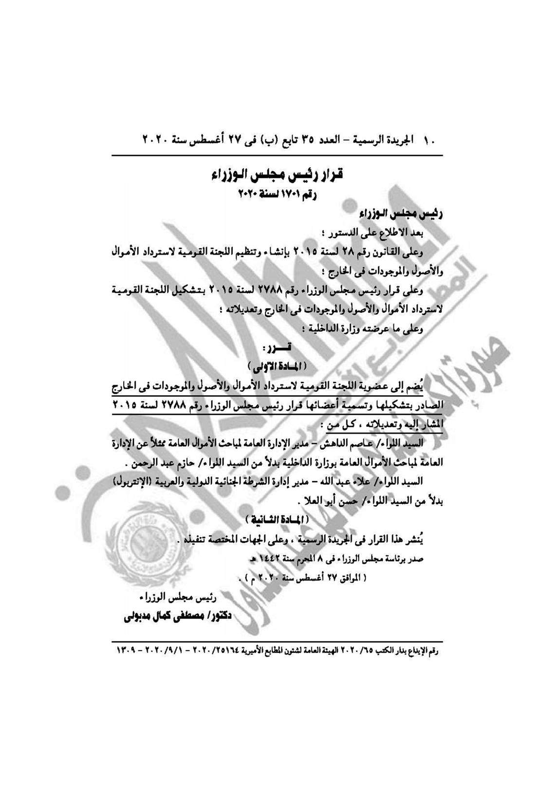 - القرار رقم 1701 لسنة 2020، بضم اللواء عاصم الداهش واللواء علاء عبد الله لعضوية اللجنة القومية لاسترداد الأموال والأصول والموجودات في الخارج.
