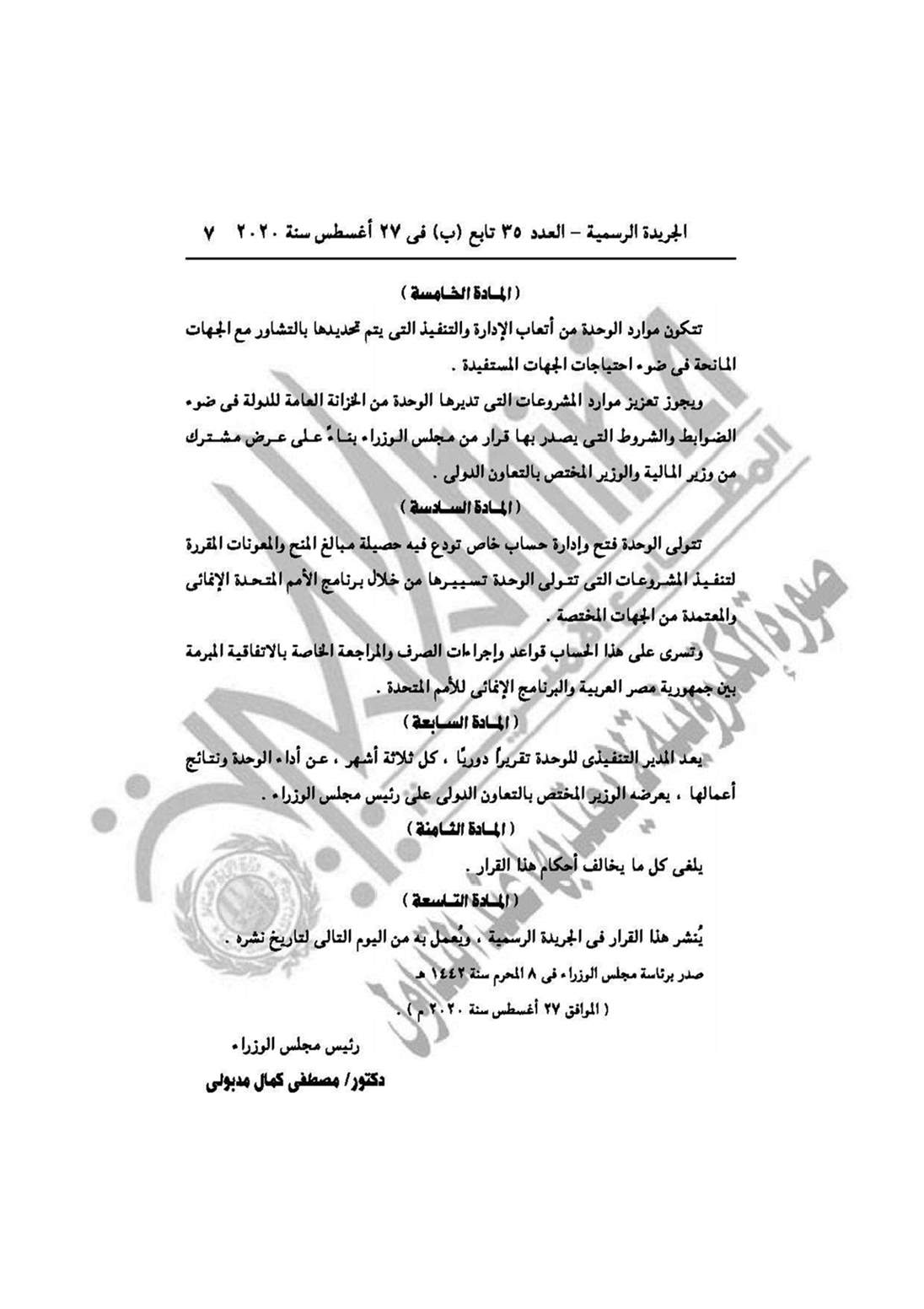 نشرت الجريدة الرسمية في عددها رقم 35 تابع (ب)، الصادر في 27 أغسطس 2020، 4 قرارات لرئيس مجلس الوزراء الدكتور مصطفى مدبولي.