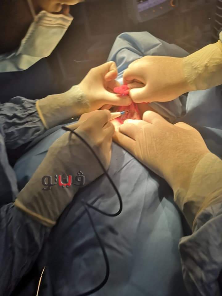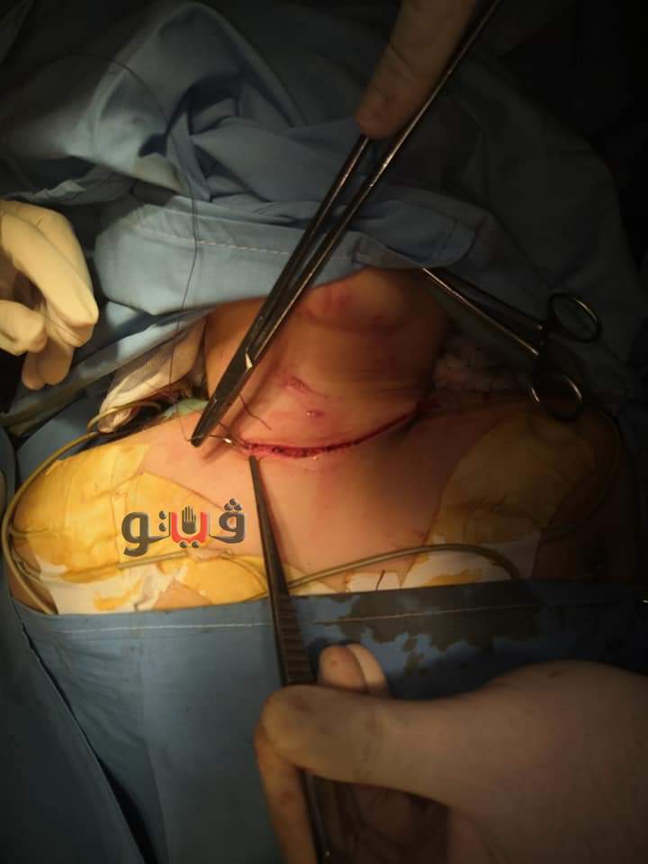 وتم تكوين فريق عمل سريع من أطباء الجراحة العامة تخصص الرأس والرقبة والتجميل لمعاونتي في اجراء العملية وهم الدكتور محمد حسين فهمي مدرس الجراحة العامة والتجميل بطب بنها والدكتور أحمد كامل مدرس مساعد الجراحة العامة والدكتور محمد خالد طبيب مقيم الجراحة العامة وتم عمل استكشاف للحنجرة والقصبة الهوائبة وخياطة الجزء المكسور وتركيب درنقة في الحيزوم الصدري خلف عظمة القص لتفريغ الهواء المتجمع حول القلب