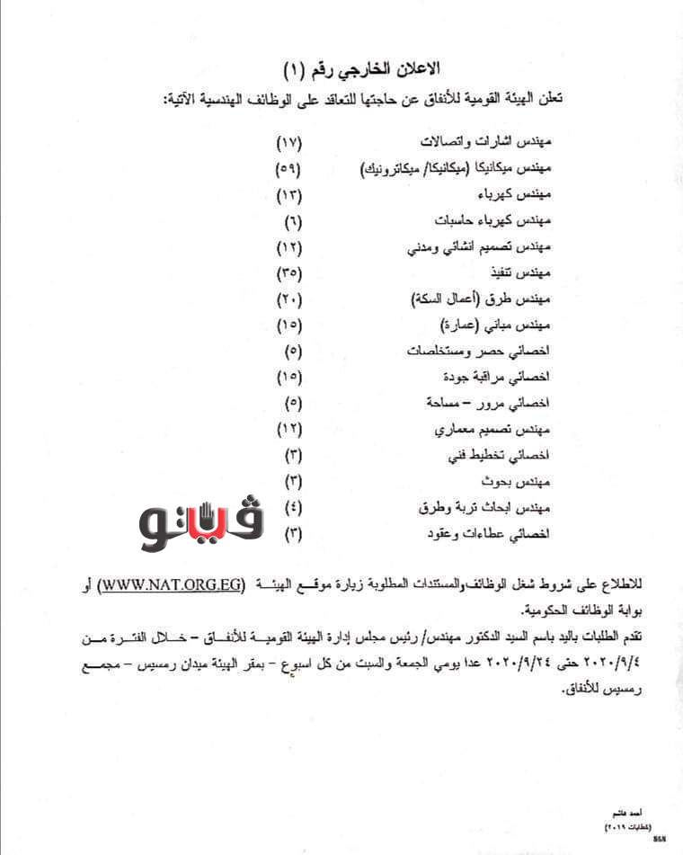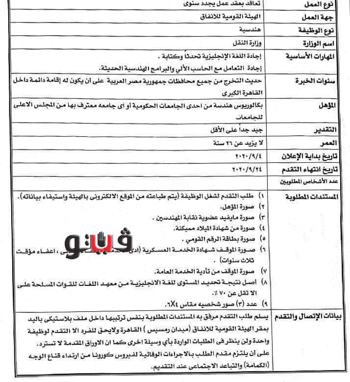 أعلنت الهيئة القومية للأنفاق رغبتها فى تعيين العديد من المهندسين فى قطاعات عدة لسد العجز فى بعض المواقع.