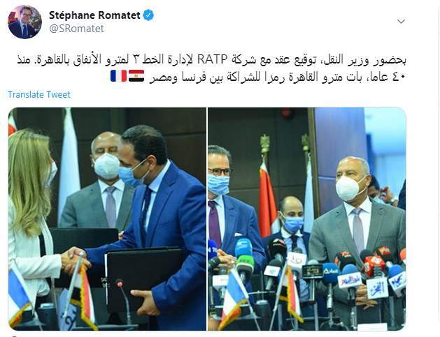 وكتب ستيفان روماتيه تغريدة على "تويتر": "بحضور وزير النقل، توقيع عقد مع شركة RATP لإدارة الخط ٣ لمترو الأنفاق بالقاهرة. منذ ٤٠ عاما، بات مترو القاهرة رمزا للشراكة بين فرنسا ومصر".