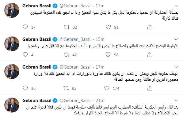 وكتب جبران باسيل تغردية على تويتر "بعد لقاء رئيس الحكومة المكلف: