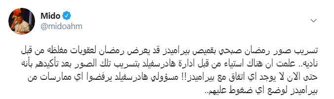 وكتب أحمد حسام "ميدو" تغريدة على تويتر: "تسريب صور رمضان صبحي بقميص بيراميدز قد يعرضه لعقوبات مغلظة من قبل ناديه".
