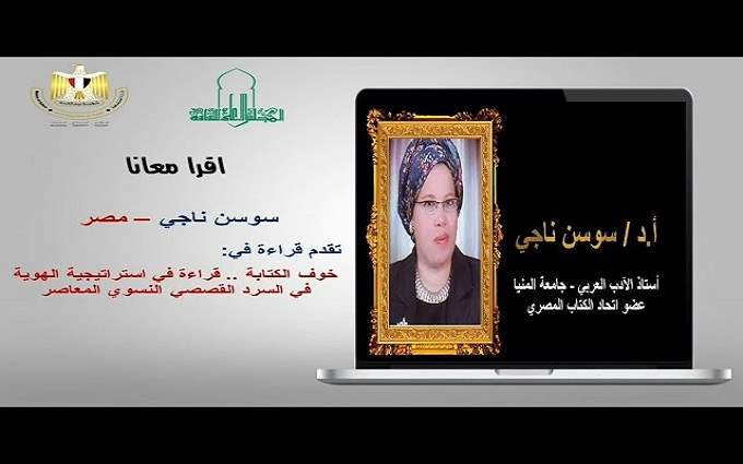 يستضيف المجلس الأعلى للثقافة في الثامنة والنصف مساءً غد الخميس,، الكاتبة والروائية الدكتورة سوسن ناجي ، أستاذ الأدب العربي بجامعة المنيا, وعضو اتحاد الكتاب المصري , لتقدم مناقشة وتعرض مقتطفات من كتاب " خوف الكتابة .. قراءة في استراتيجية الهوية في السرد القصصي النسوي المعاصر" الصادر عن المجلس الأعلى للثقافة عام 2013، وذلك عبر قناة أمانة المؤتمرات بالمجلس على موقع الفيديوهات الشهير "يوتيوب".