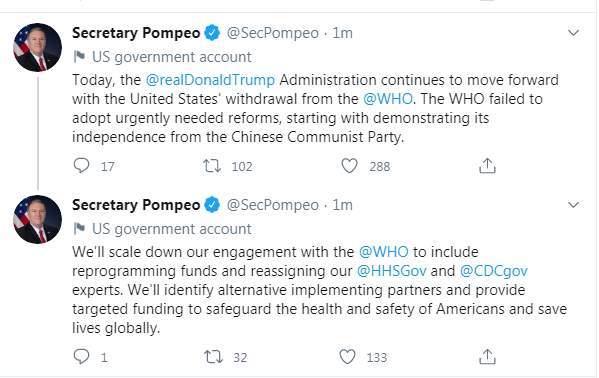 وكتب مايك بومبيو تغريدة على تويتر "سنقلل من مشاركتنا مع منظمة الصحة العالمية لتشمل إعادة برمجة الأموال وإعادة تخصيص خبراء الصحة الأمريكية.