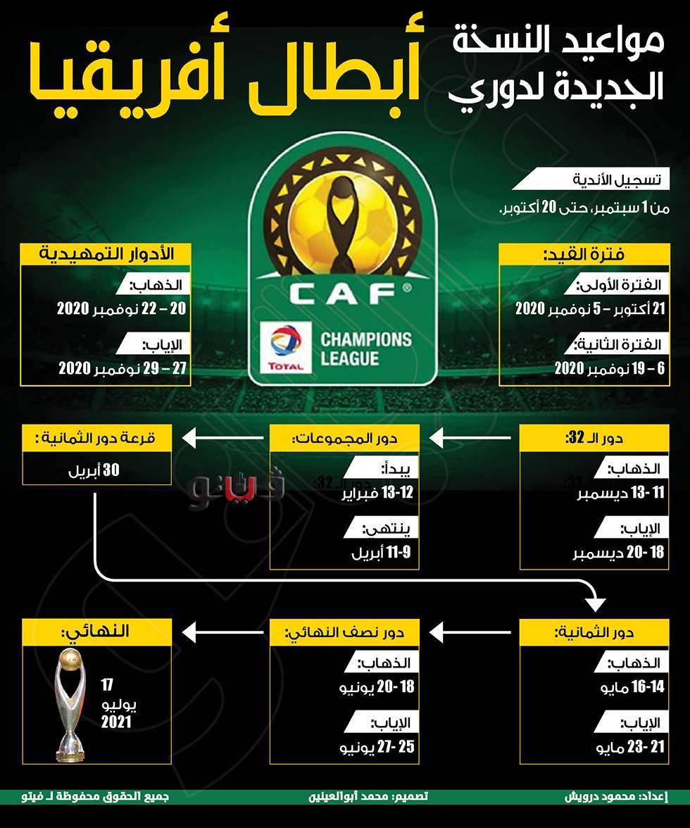 مواعيد النسخة الجديدة لدوري أبطال أفريقيا| إنفوجراف الخميس 03/سبتمبر/2020 - 06:57 م 9/3/2020 6:57:52 PM تعرف على المواعيد النسخة الجديدة لدوري أبطال أفريقيا شارك طباعة 18 حجم الخط شارك طباعة دوري أبطال أفريقيا بطول افريقيا كأس أفريقيا