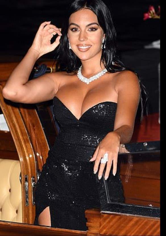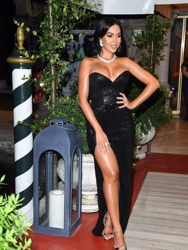 وتميز فستان جورجينا برقبة على شكل قلب مغطاة بالترتر الأسود، في حين أنه يتميز أيضًا بفتحة جانبية أضاف مزيدًا من التألق إلى إطلالتها المسائية مع عقد ألماس مذهل وزوج من الأقراط المتطابقة.