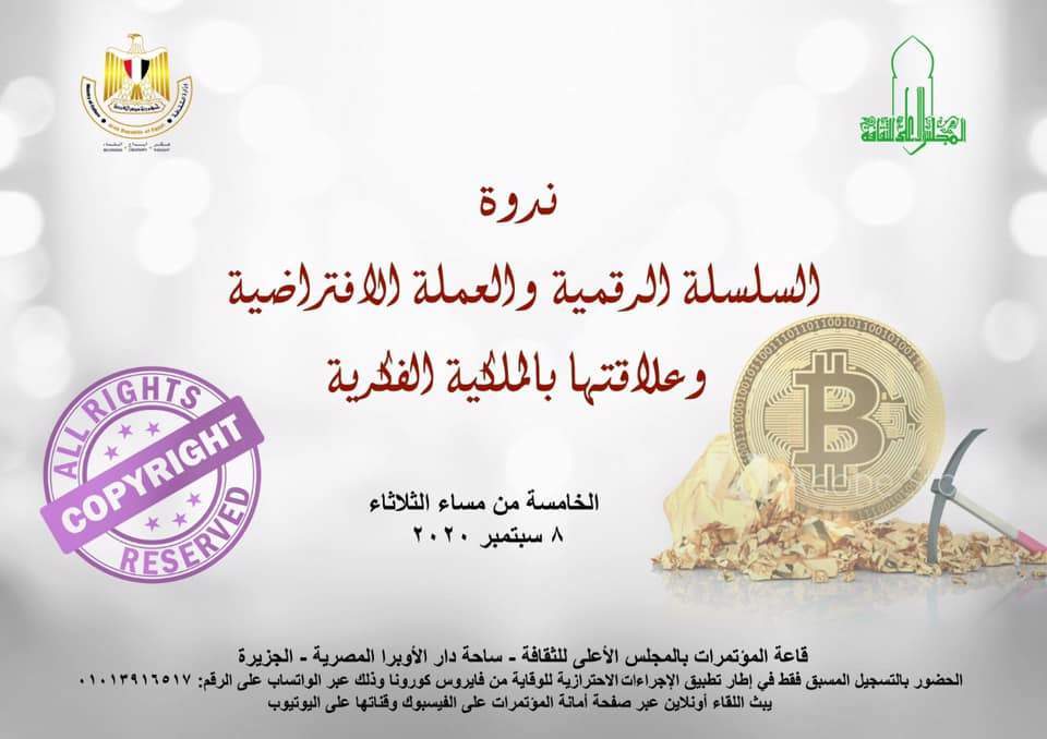 تنظم لجنة حماية الملكية بالمجلس الأعلى للثقافة, يوم الثلاثاء الموافق 8 سبتمبر الحالي, في تمام الساعة الخامسة عصراً, جلسة نقاشية حول "السلسلة الرقمية والعملة الافتراضية وعلاقتها بالملكية الفكرية", بأمانة الدكتور هشام عزمي , والدكتور حسام لطفي رئيس لجنة حماية الملكية الفكرية بالمجس, وذلك بالتعاون مع لجنة الثقافة الرقمية والبنية المعلوماتية برئاسة المهندس زياد عبد التواب.