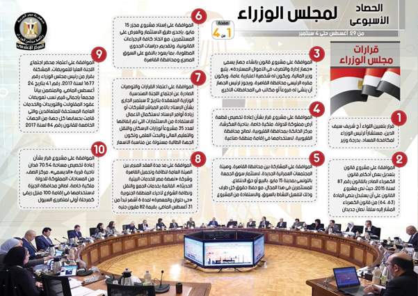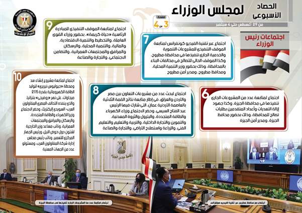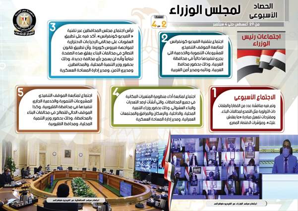 نشر المركز الإعلامي لمجلس الوزراء، تقريراً يسلط الضوء على الحصاد الأسبوعي لمجلس الوزراء، خلال الفترة من 29 أغسطس حتى 4 سبتمبر 2020، والذي تضمن الموافقة على عدد من القرارات، فضلاً عن الاجتماعات واللقاءات التي عقدها الدكتور مصطفى مدبولي، رئيس مجلس الوزراء، بالإضافة إلى ما قام به من أنشطة.
