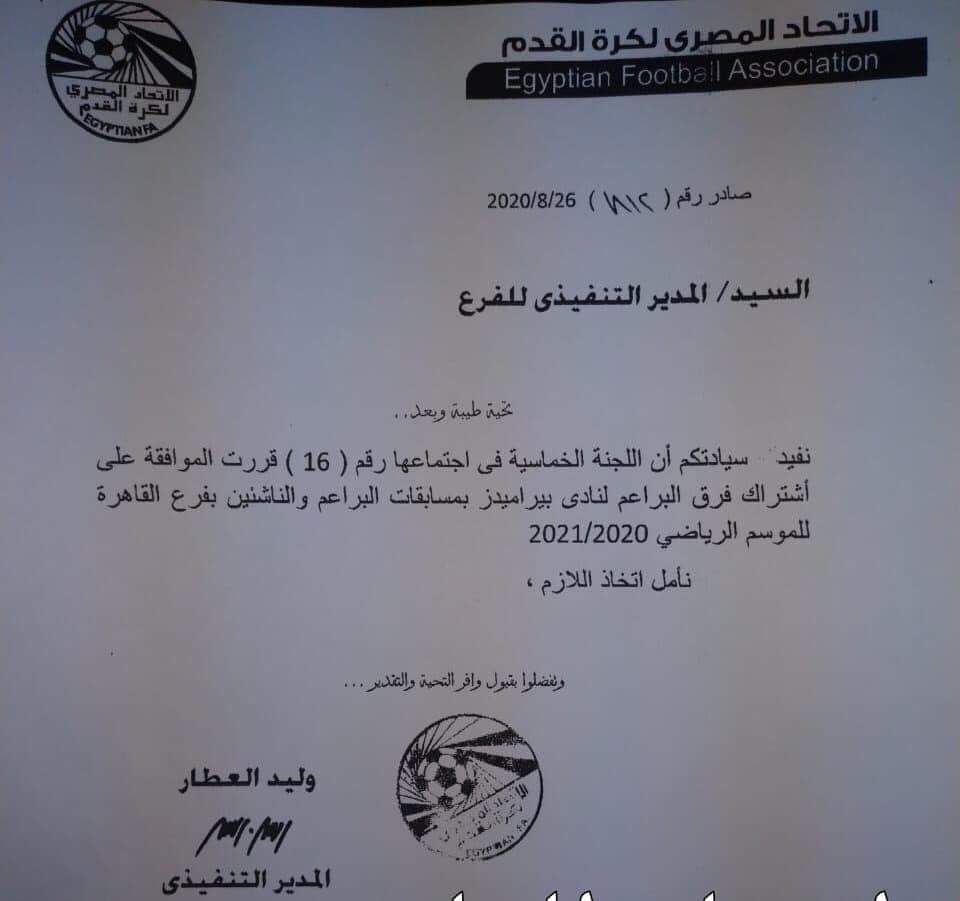 وأخطرت اللجنة الخماسية، منطقة القاهرة لكرة القدم بخطاب رسمي معتمد من المدير التنفيذي لاتحاد الكرة، وليد العطار، بالموافقة على مشاركة بيراميدز في دوري الناشئين والبراعم بالموسم الجديد.