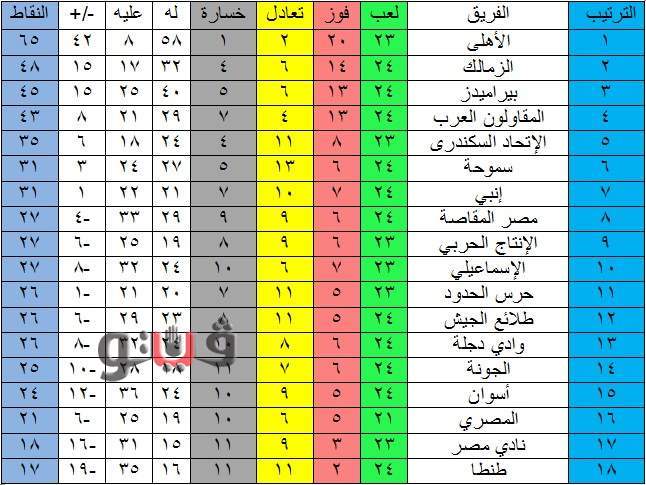تنشر فيتو جدول ترتيب أندية الدوري الممتاز بعد إنتهاء مباريات الجولة الـ 24 اليوم الجمعة بلقاء الأهلي ووادي دجلة، والتي حسمها الأحمر لصالحه بهدفين دون مقابل.