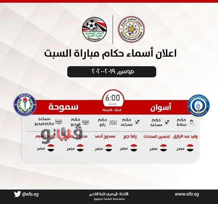 أعلنت لجنة الحكام الرئيسية بالاتحاد المصري لكرة القدم، أسماء حكام مباراة أسوان وسموحة بالجولة 25 من بطولة الدوري الممتاز على النحو التالي: