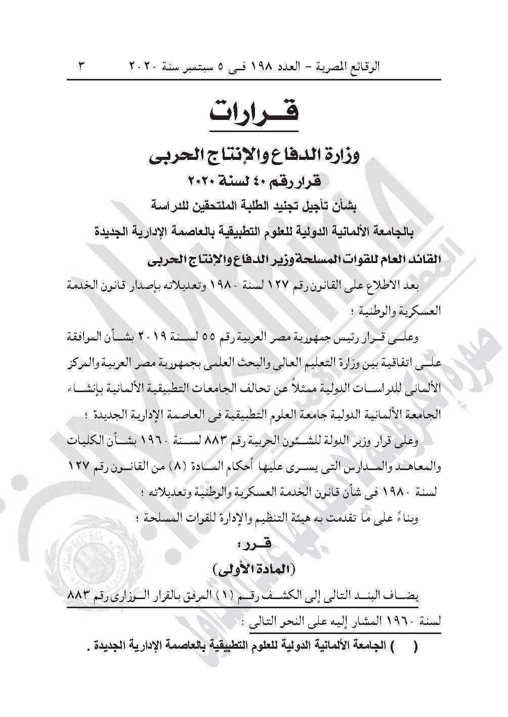 نشرت جريدة الوقائع المصرية في عددها رقم 198، الصادر في 5 سبتمبر 2020، قرار وزارة الدفاع والإنتاج الحربي رقم 40 لسنة 2020، بشأن تأجيل تجنيد الطلبة الملتحقين للدراسة بالجامعة الألمانية الدولية للعلوم التطبيقية بالعاصمة الإدارية الجديدة.
