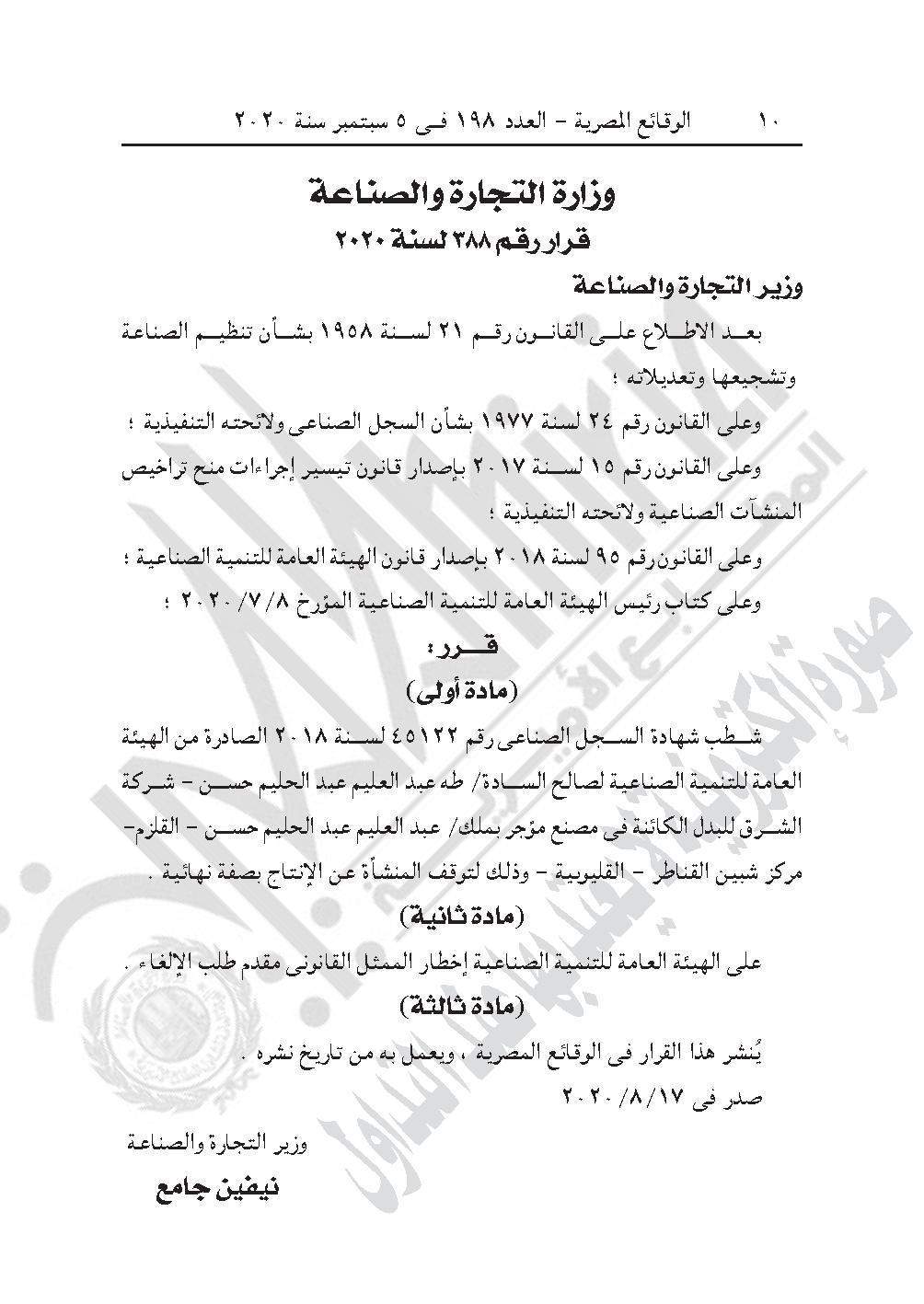 وينص القرار في مادته الأولى على شطب شهادة السجل الصناعي رقم 45122 لسنة 2018، الصادرة من الهيئة العامة للتنمية الصناعية لصالح طه عبد العليم عبد الحليم حسن، شركة الشرق للبدل، بمصنع مؤجر بملك عبد العليم عبد الحليم حسن، القلزم شبين القناطر القليوبية، وذلك لتوقف المنشأة عن الإنتاج بصفة نهائية.