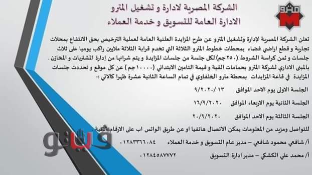وجاء بمزايدة المترو انه تقرر ان يتم الطرح من خلال الناقصة العامة بمحطة مترو الخلفاوى كمقر معروف للجميع على ان يتم سحب كراسة الشروط مقابل مبالغ مالى معلن سابقا من خلال ادارة التسويق بالشركة.