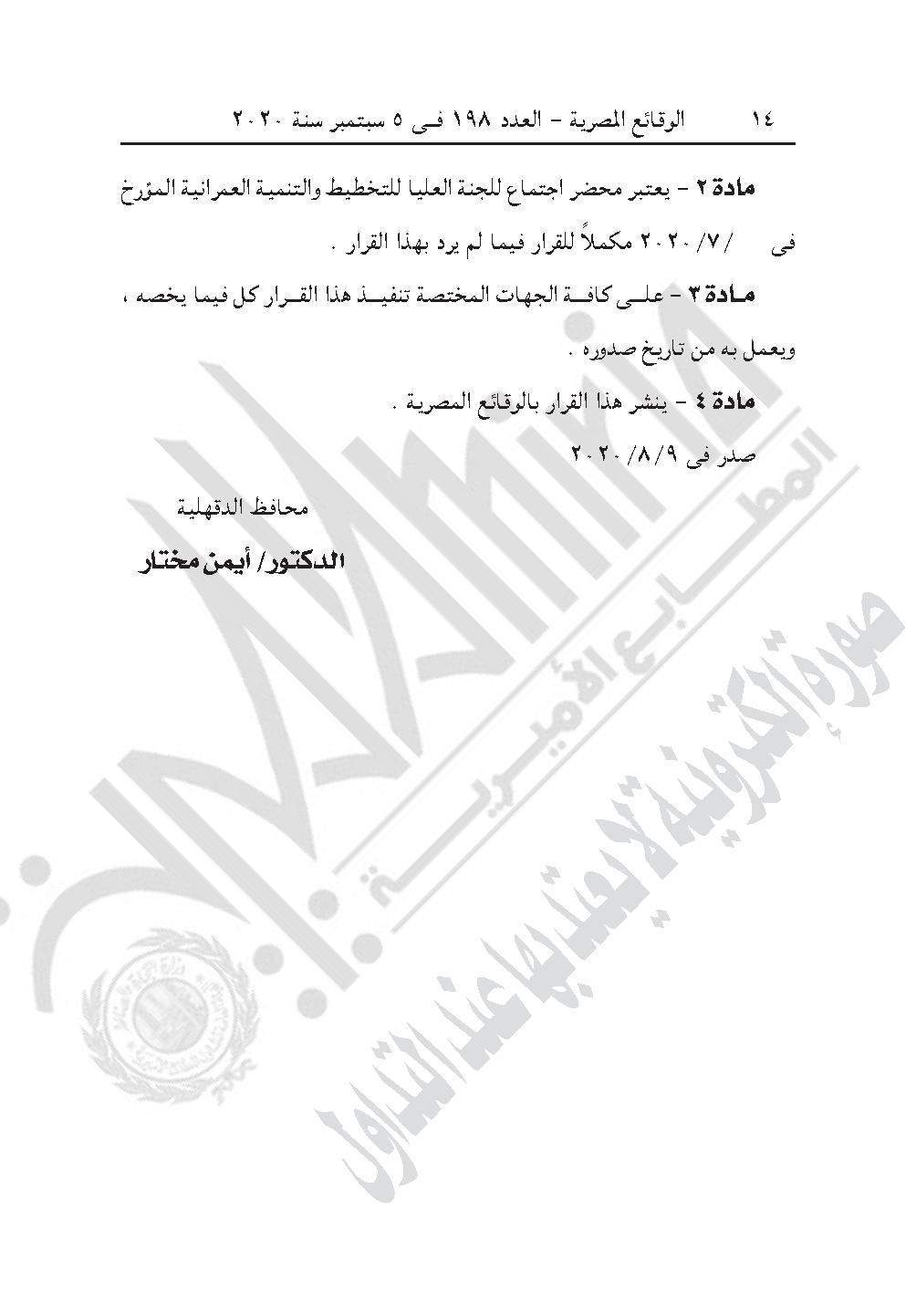 نشرت جريدة الوقائع المصرية في عددها رقم 198، الصادر في 5 سبتمبر 2020، قرار محافظة الدقهلية رقم 434 لسنة 2020، بشأن تعديل المخططات التفصيلية لمدينة طلخا.