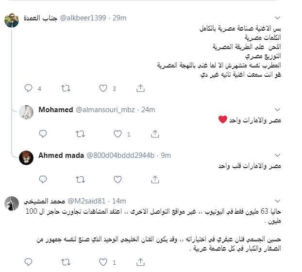 وعلق محمد المشيخي: "حاليا 63 مليون فقط في اليوتيوب، غير مواقع التواصل الأخرى ،، أعتقد المشاهدات تجاوزت حاجز الـ 100 مليون، حسين الجسمي فنان عبقري في اختياراته، وقد يكون الفنان الخليجي الوحيد الذي صنع لنفسه جمهورا من الصغار والكبار في كل عاصمة عربية".