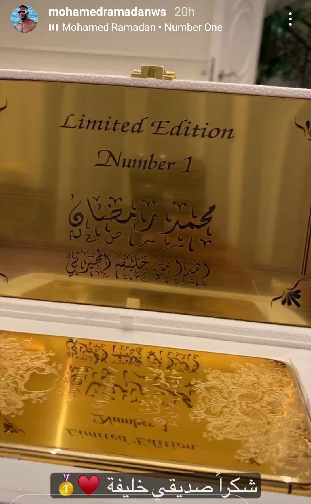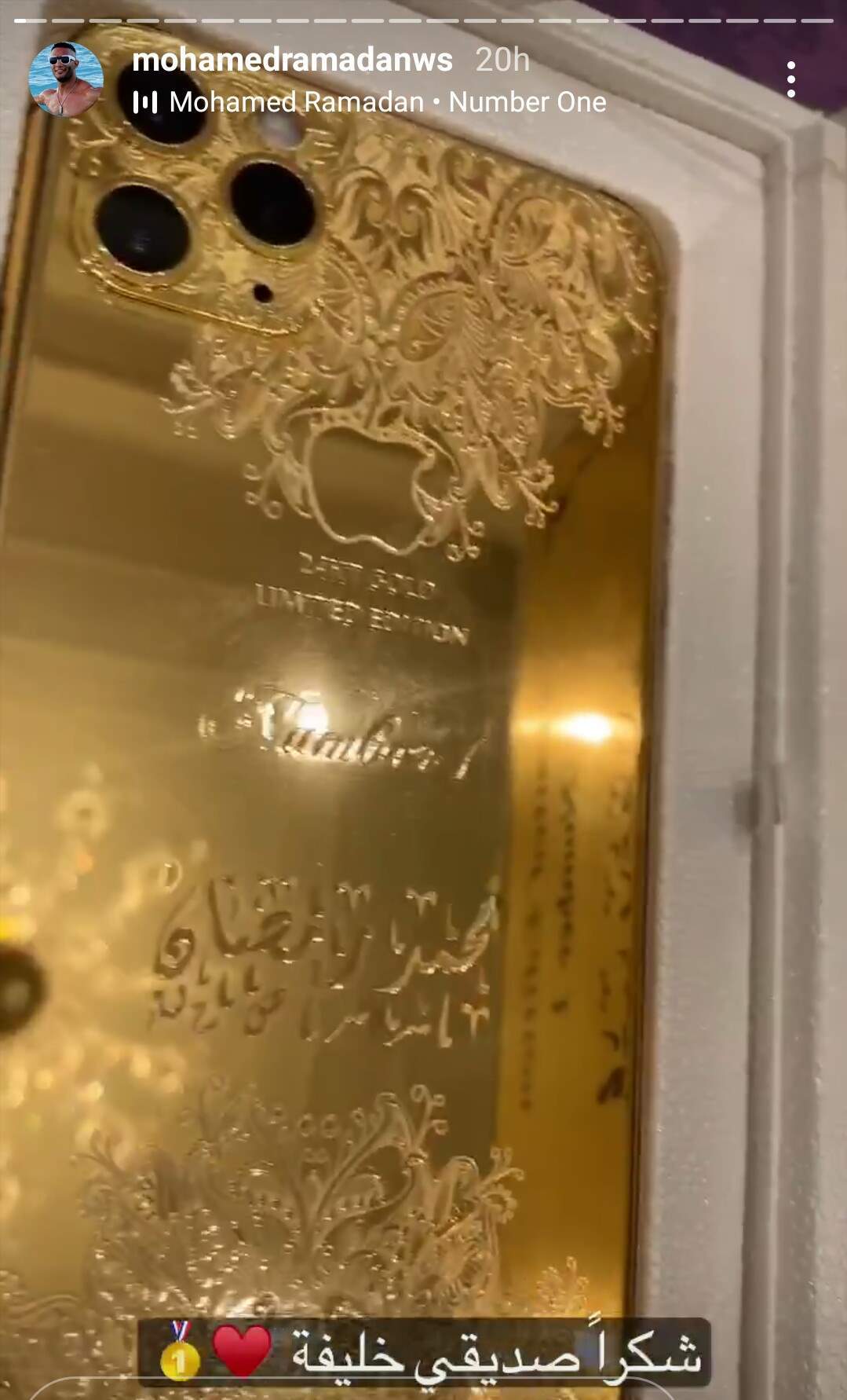 ويظهر الفيديو أن الهدية عبارة عن هاتف محمول من الذهب حفر على ظهره اسم محمد رمضان ونمبر 1، حيث علق محمد رمضان على الفيديو قائلا: "شكرا صديقي خليفة".