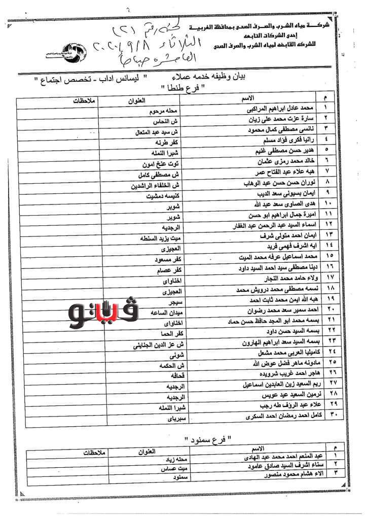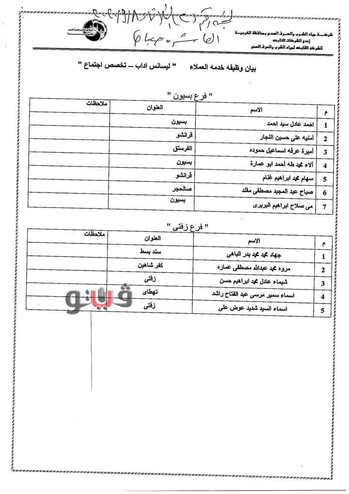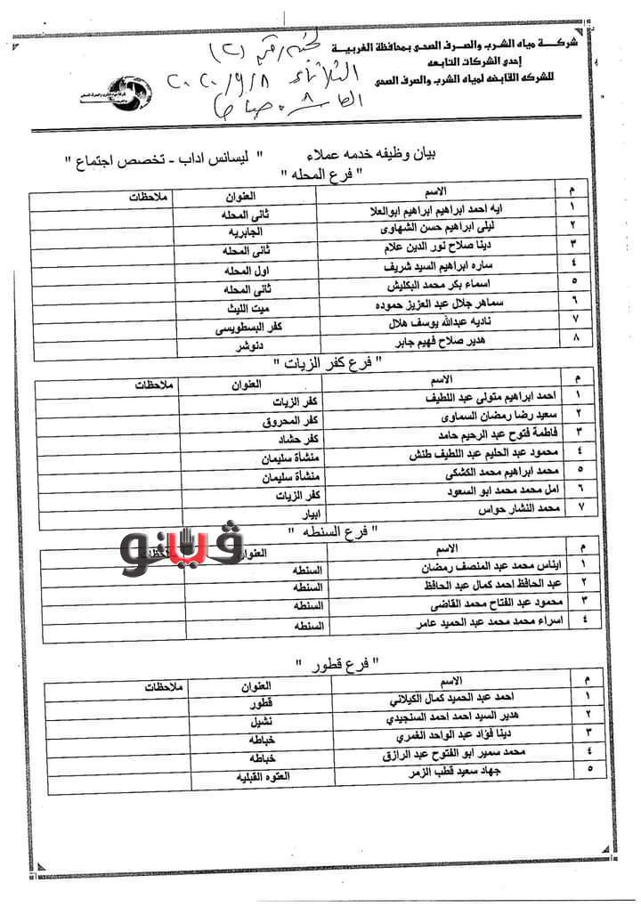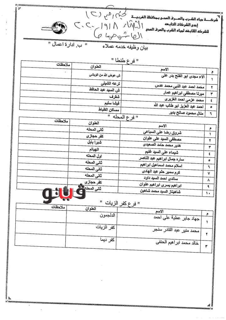 ننشر أسماء المرشحين لوظيفة كاتب وأخصائي أمن وخدمة عملاء بمياه الشرب بالغربية