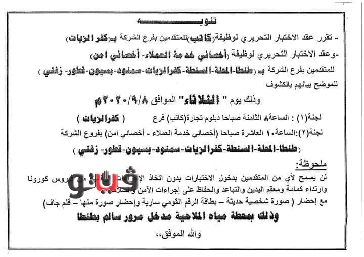 أعلنت شركة مياه الشرب والصرف الصحي بالغربية اليوم السبت عن تحديد يوم الثلاثاء المقبل موعدا لأداء الاختبار التحريري للمتقدمين لوظيفة كاتب وأخصائي خدمة عملاء وأخصائي أمن بفروع جميع المراكز الثمانية .