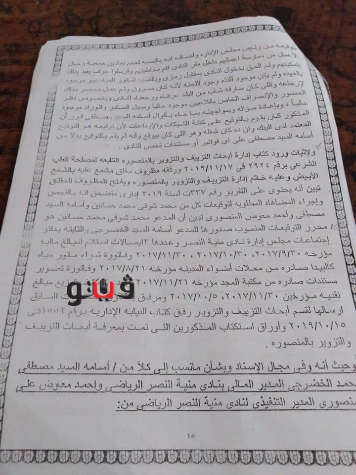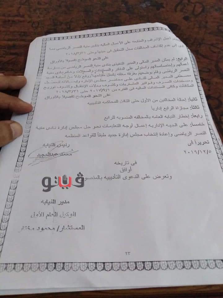 بسبب فساد مالي وإداري.. إحالة مجلس إدارة نادي منية النصر بالقسم الثالث للمحاكمة | مستندات