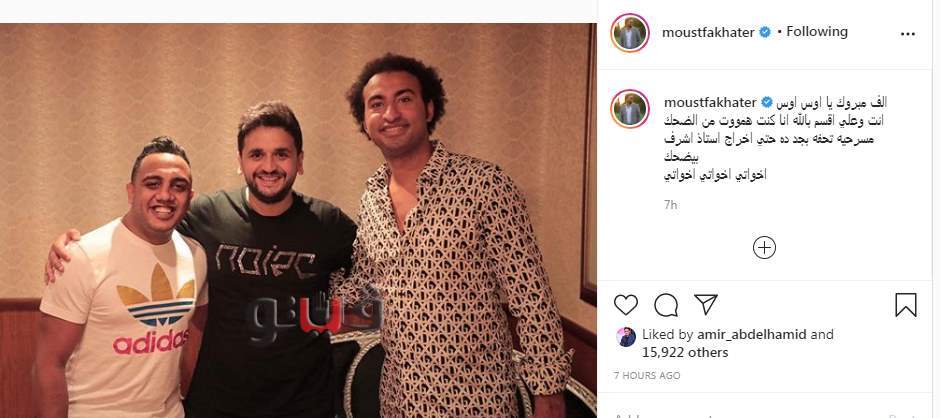 وعلق خاطر علي الصورة قائلاً : «الف مبروك يا اوس اوس انت وعلي اقسم بالله انا كنت هموت من الضحك مسرحية تحفة بجد ده حتي اخراج استاذ اشرف بيضحك».