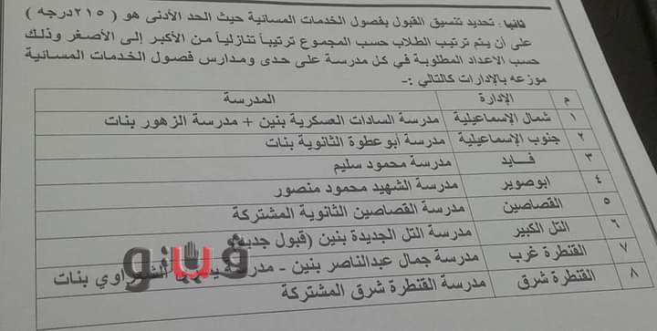 وأشار إلى أنه تم تحديد تنسيق القبول بوصول الخدمات المسائية حيث الحد الأدنى هو 215 على أن يتم ترتيب الطلاب حسب المجموع ترتيبا تنازليا من الأكبر إلى الأصغر وذلك حسب الأعداد المطلوبة في كل مدرسة على حدة ومدارس فصول الخدمات المسائية.