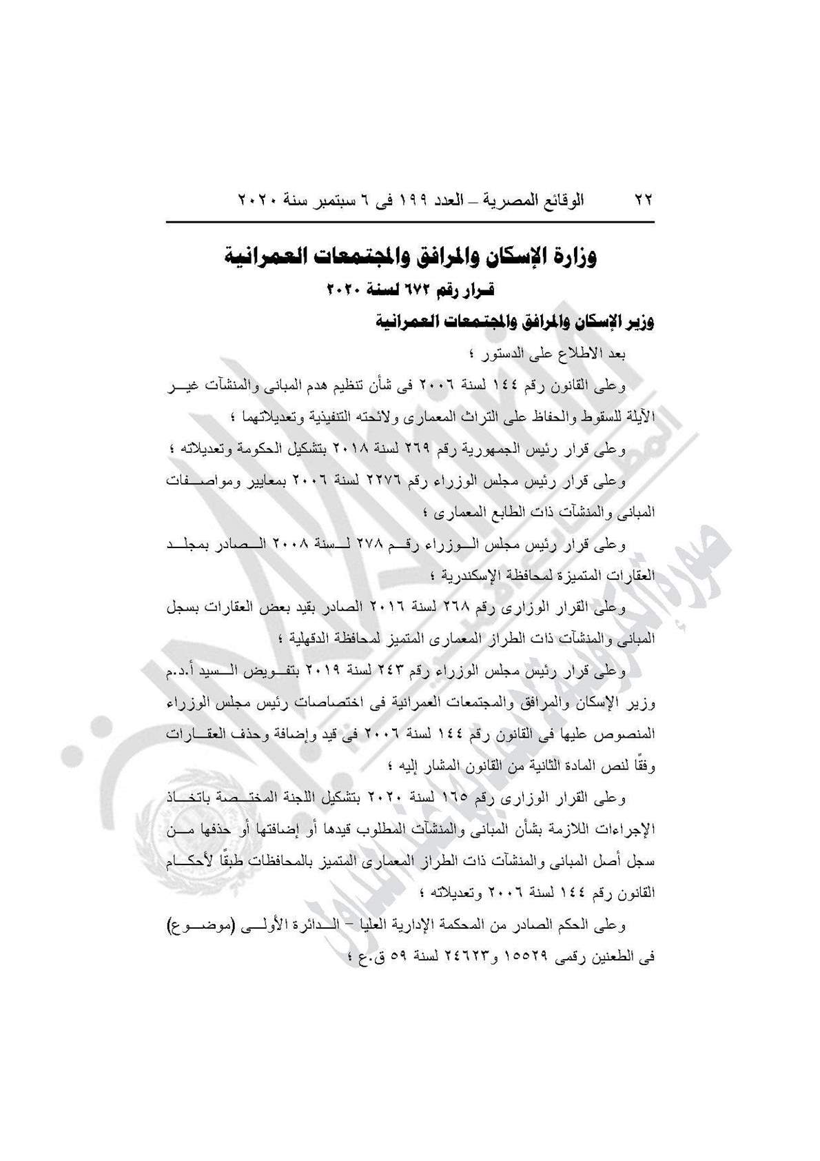 نشرت جريدة الوقائع المصرية في عددها رقم 199، الصادر في 6 سبتمبر 2020، قرار وزارة الإسكان والمرافق والمجتمعات العمرانية رقم 672 لسنة 2020، بحذف عقارين من سجل المباني والمنشآت ذات الطراز المتميز بالإسكندرية والدقهلية.