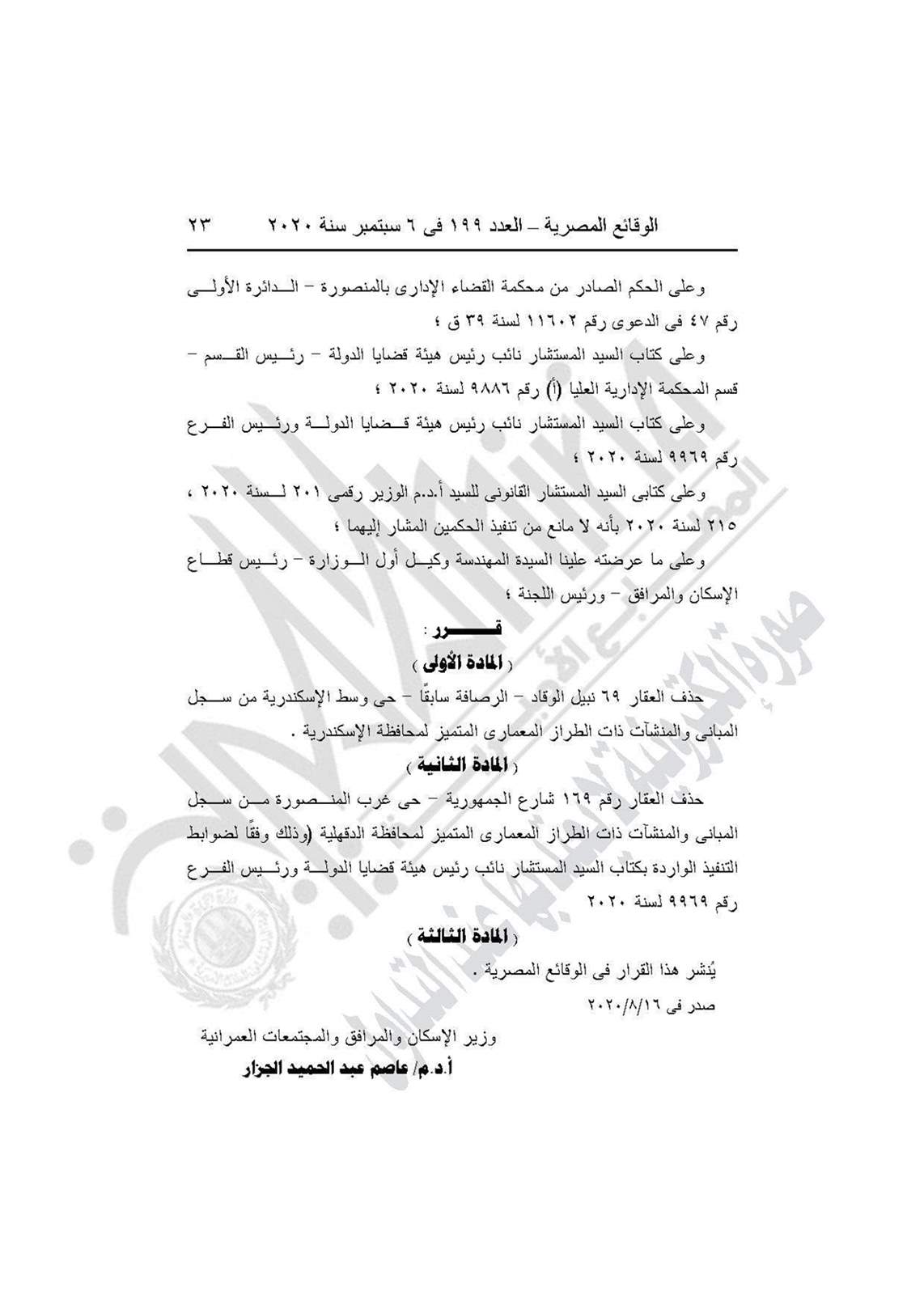 كما ينص القرار على حذف العقار رقم 169 شارع الجمهورية حي غرب المنصورة من سجل المباني والمنشآت ذات الطراز المعماري المتميز لمحافظة الدقهلية (وذلك وفقًا لضوابط التنفيذ الواردة بكتاب المستشار نائب رئيس هيئة قضايا الدولة ورئيس الفرع رقم 9969 لسنة 2020.
