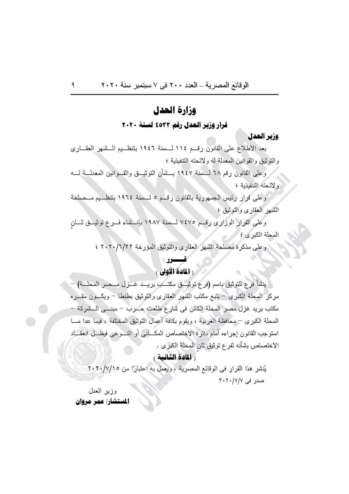 نشرت جريدة الوقائع المصرية في عددها رقم 200، الصادر في 7 سبتمبر 2020، 5 قرارات لوزير العدل المستشار عمر مروان بإنشاء أفرع للتوثيق بمكاتب بريد غزل المحلة وسنباط وكفر الزيات وكفر كلا الباب وبسيون بمحافظة الغربية.