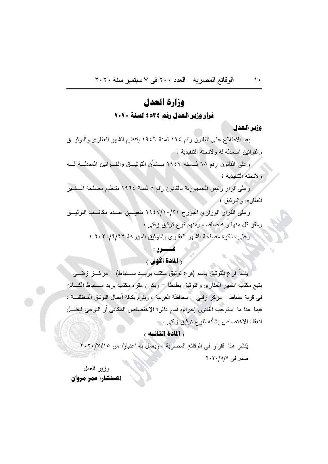 القرار رقم 4534 لسنة 2020، بإنشاء فرع للتوثيق باسم (فرع توثيق مكتب بريد سنباط) مركز زفتى يتبع مكتب الشهر العقاري والتوثيق بطنطا، ويكون مقره مكتب بريد سنباط الكائن في قرية سنباط مركز زفتى محافظة الغربية، ويقوم بكافة أعمال التوثيق المختلفة، فيما عدا ما استوجب القانون إجراءه أمام دائرة الاختصاص المكاني أو النوعى فيظل انعقاد الاختصاص بشأنه لفرع توثيق زفتى.